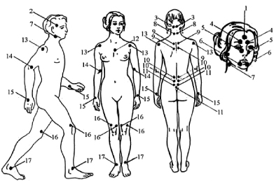 1 - лобная, 2 - височная, 3 - затылочная, 4 - надглазничная, 5 - “собачья ямка”, 6 - подбородочная, 7 - шейно-подчелюстная, 8 - заднешейная, 9 - верхнеспинная, 10 - пояснчиная, 11 - кресцовая, 12 - грудинная, 13 - плечевая, 14 - локтевая, 15 - лучзапястная, 16 - коленная, 17 - голеностопная.