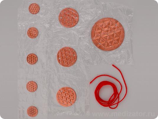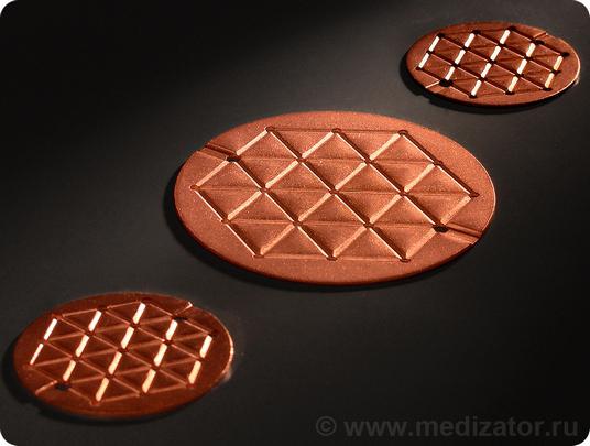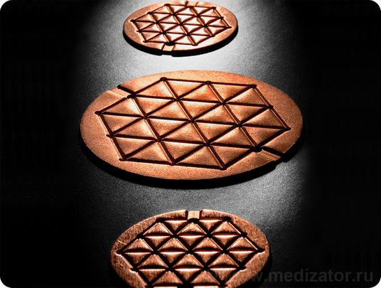 Диски различного диаметра, входящие в комплект прибора, используются для прикладывания к поврежденным участкам тела, царапинам, угрям и синякам... Их использование помогает в лечении псориатических бляшек, подчелюстных лимфоузлов при ангине, прочих нарушениях кожных покровов.